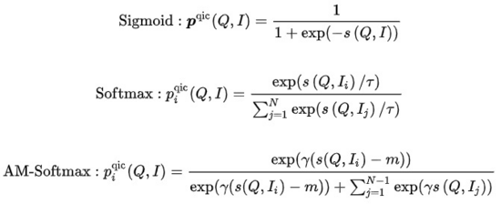 - Query Item Matching (QIM):一个Query下点击最多的Item作为正样本,Batch内与当前Query相似度最高的其他Item作为负样本。QIM使用跨模态Encoder的[CLS] token计算预测概率,最小化交叉熵Loss: