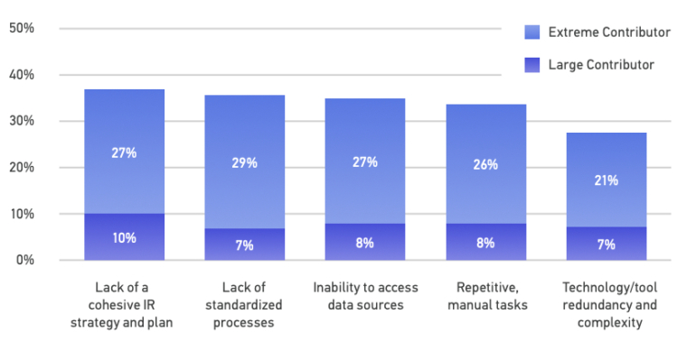 报告数据显示,造成DFIR资源浪费的最大原因是缺乏连贯的事件取证计划和工作策略(37%),以及缺乏标准化流程(36%)。其他因素还包括无法访问数据来源(35%)、重复手动的任务(34%)、技术工具冗余及复杂化(28%)。