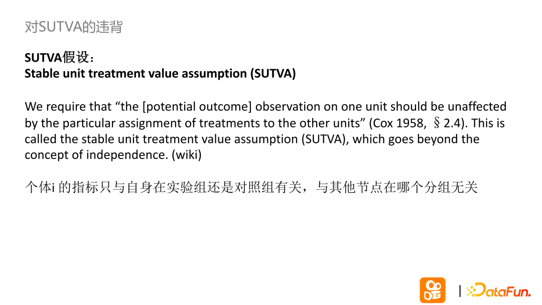 SUTVA 假设,个体 i 在实验过程中只与自身被分配在实验组或者对照组相关,与实验体系下其他节点在哪个分组无关,不论其他节点是合作关系还是竞争关系。SUTVA 是 AB 实验得到有效结论最基础的假设。