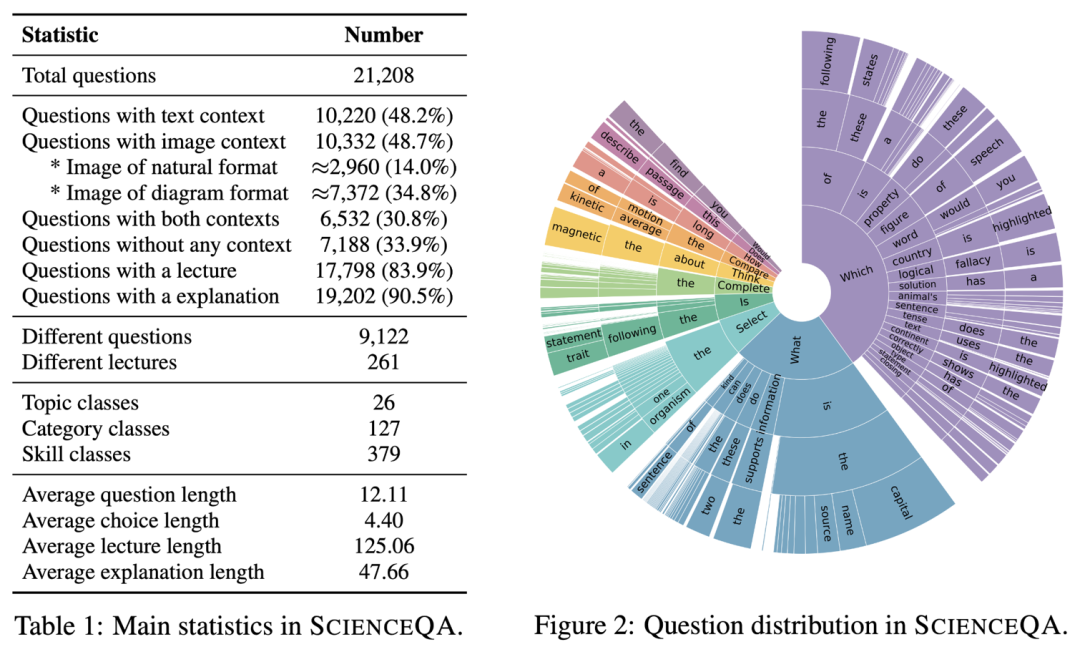 ScienceQA 包含 21208 个例子, 其中有 9122 个不同的问题(question)。10332 道(48.7%)有视觉背景信息,10220 道(48.2%)有文本背景信息,6532 道(30.8%)有视觉 文本的背景信息。绝大部分问题标注有详细的解释:83.9% 的问题有背景知识标注(lecture),而 90.5% 的问题有详细的解答(explanation)。