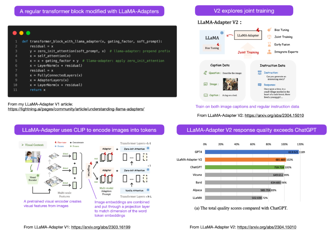 Sebastian 预测本月会看到更多的多模态 LLM 模型,因此不得不谈到不久前发布的论文《LLaMA-Adapter V2: Parameter-Efficient Visual Instruction Model》。先来回顾一下什么是 LLaMA-Adapter?它是一种参数高效的 LLM 微调技术,修改了前面几个 transformer 块并引入一种门控机制来稳定训练。