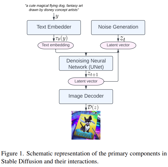 首先来看一下 Stable Diffusion 的主要组成部分,包括:文本嵌入器(text embedder)、噪声生成(noise generation)、去噪神经网络(denoising neural network)和图像解码器(image decoder,如下图 1 所示。