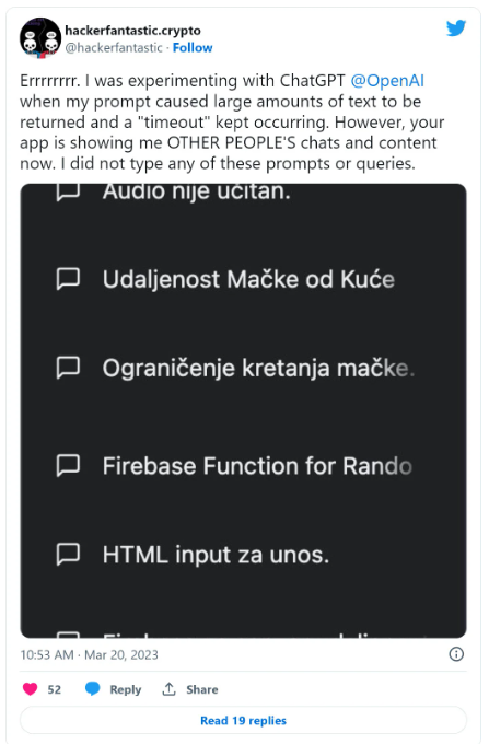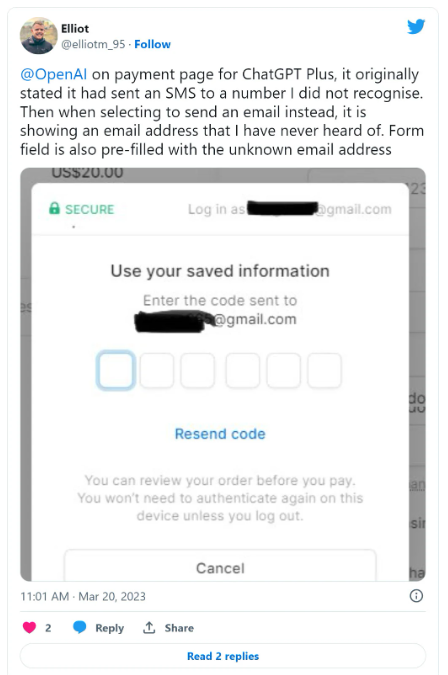 3月20日,多名ChatGPT订阅用户称在其订阅页面看到了其他用户的邮箱地址。