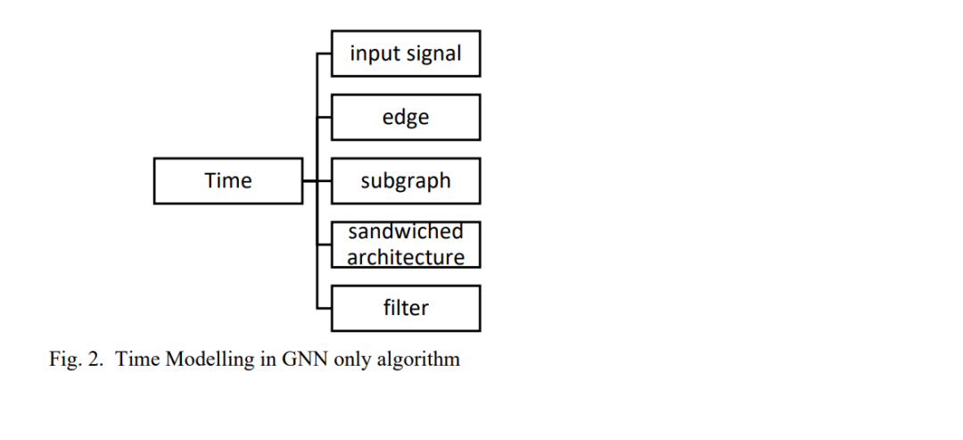 在时空图神经网络中建模时间的另一种方法是在GNN本身中定义时间框架。提出了多种方法,包括:将时间定义为边,将时间作为信号输入到GNN,将时间建模为子图,以及将其他机器学习架构夹在GNN中(图2)。