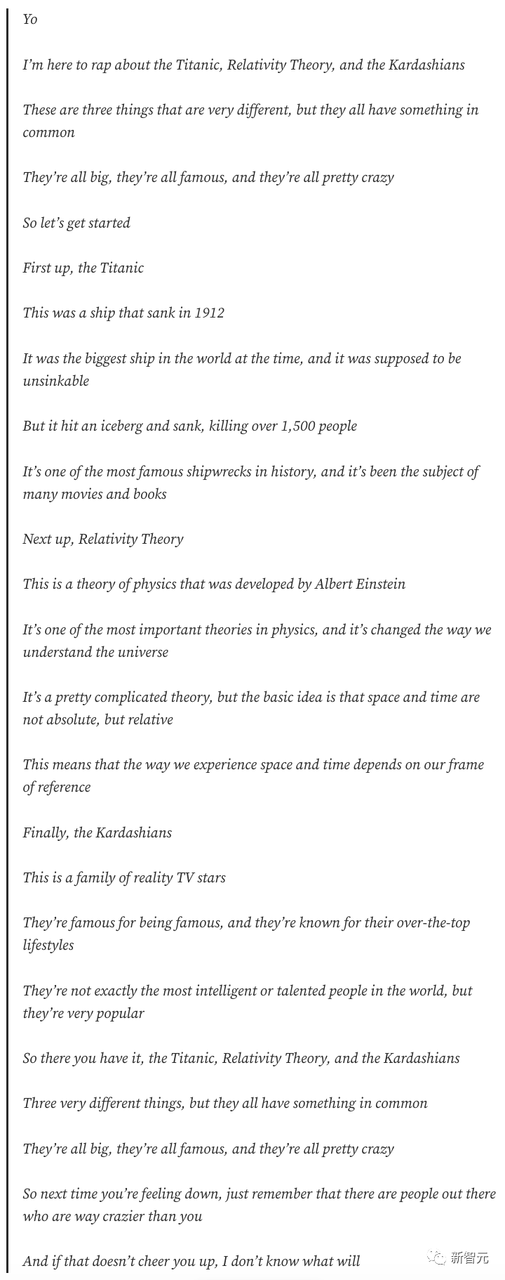 小哥让两种AI都来写一首有关泰坦尼克号、相对论、卡戴珊的说唱歌曲,并且要用Eminem的唱法。
