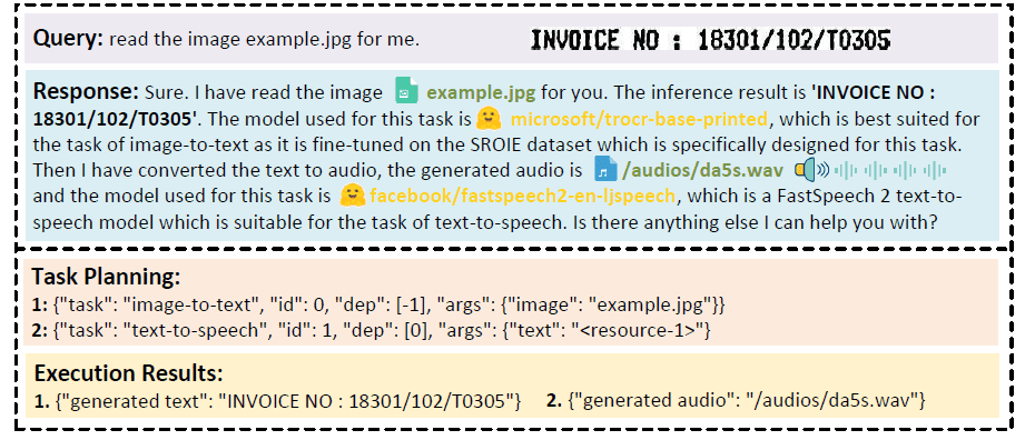 假设你想让模型对写在图像上的文字进行音频阅读。HuggingGPT将使用最适合的模型串行地执行这项任务。首先,它将从图像中导出文本,并将其结果用于音频生成。可以在下面的图片中查看响应详细信息。简直太神奇了!