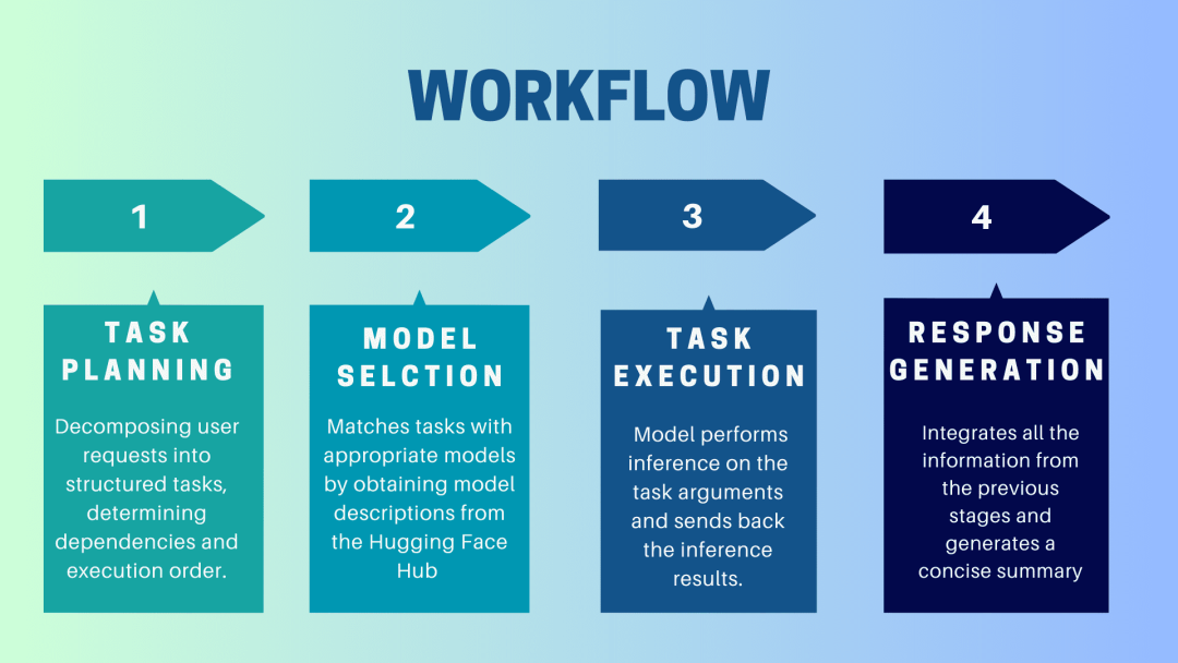 HuggingGPT是一个协作系统,它使用LLM作为接口,向专家模型发送用户请求。从用户提示到模型直到收到响应的完整过程可以分解为以下不连续的步骤: