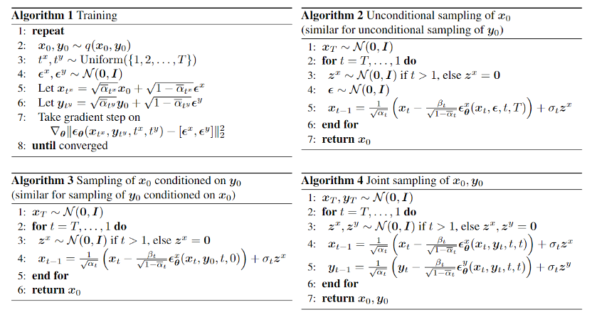 下面罗列了 UniDiffuser 的训练和采样算法,可见这些算法相对原始的扩散模型均只做了微小的改动,易于实现。