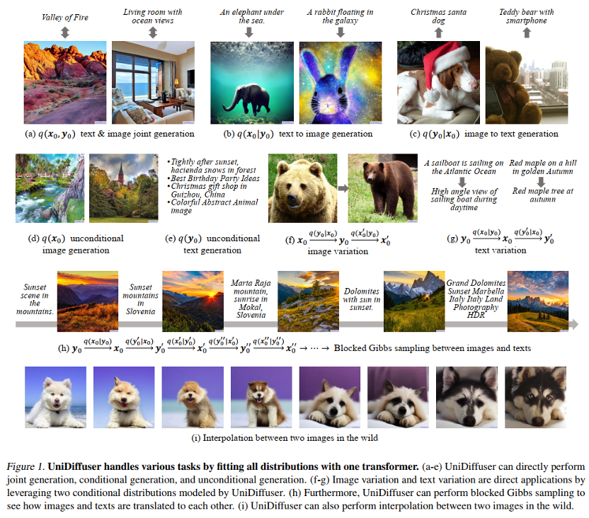 该论文提出了一个为多模态设计的概率建模框架 UniDiffuser,并采用该团队提出的基于 transformer 的网络架构 U-ViT,在开源的大规模图文数据集 LAION-5B 上训练了一个十亿参数量的模型,使得一个底层模型能够高质量地完成多种生成任务(图 1)。简单来讲,除了单向的文生图,还能实现图生文、图文联合生成、无条件图文生成、图文改写等多种功能,大幅提升文图内容的生产效率,也进一步提升了生成式模型的应用想象力。