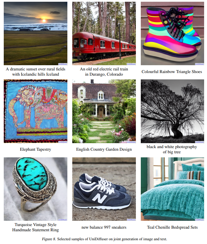 如下的图 8 展示了 UniDiffuser 在图文联合生成的效果:
