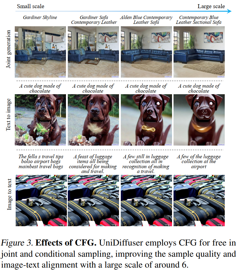 此外,由于 UniDiffuser 同时建模了条件分布和无条件分布,因此 UniDiffuser 天然地支持 classifier-free guidance。下面的图 3 展示了 UniDiffuser 的条件生成和联合生成在不同的 guidance scale 下的效果: