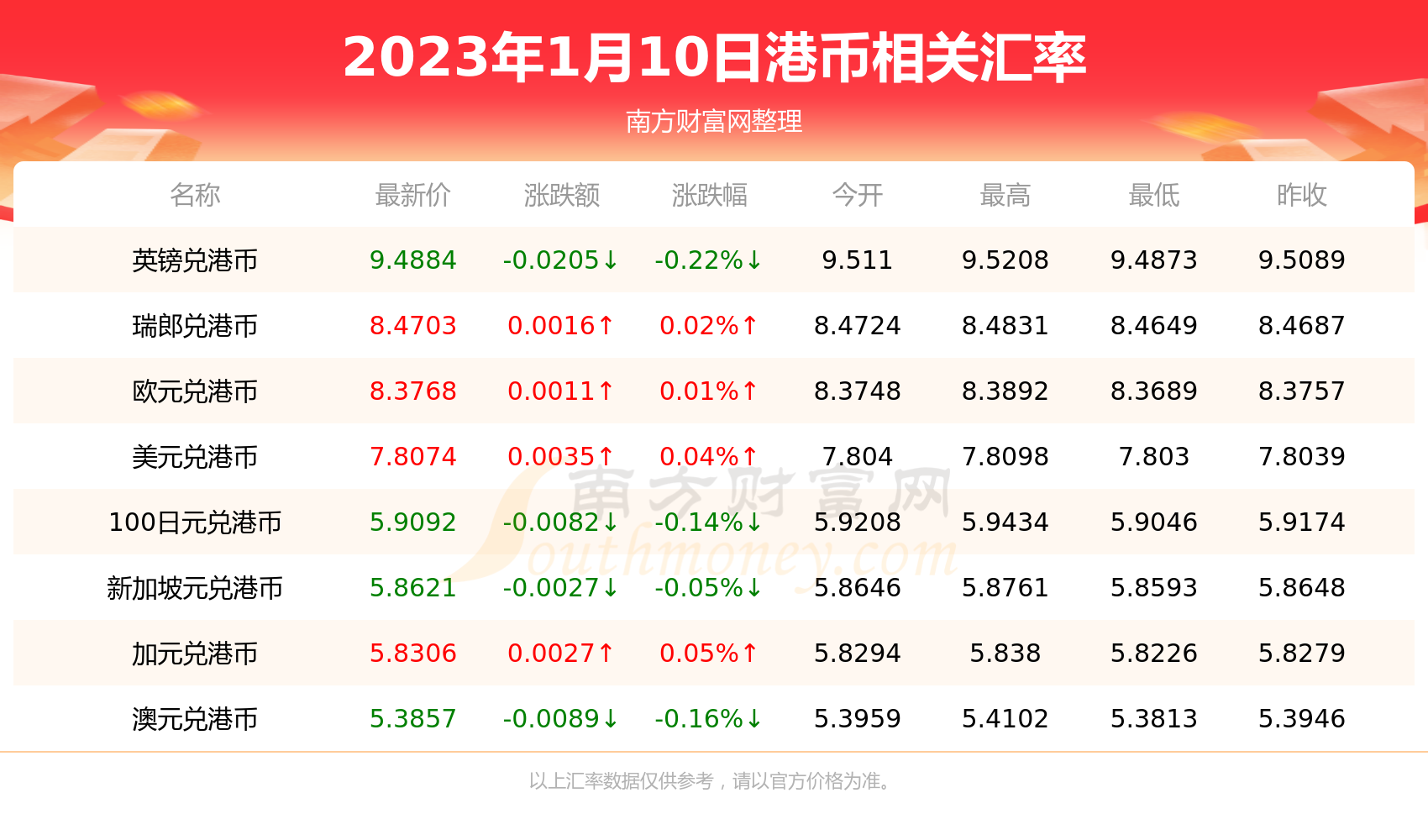2023年1月10日港币相关汇率查询