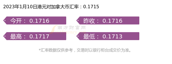 2023年1月10日最新消息,港元兑换加拿大币最新汇率为0.1715,今开为0.1716,昨收为0.1716,最高为0.1717,最低为0.1713。