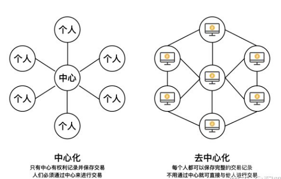 去中心化其概念与中心化相对,中心化是指所有交易都由一个中心来进行记录以及存储,而去中心化则是每个人都拥有完整的交易记录,所以不需要中心的存在。在比特币网络中每一个节点都保存了完整的交易记录,同时节点也都有平等的记账权利。