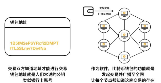 比特币钱包有两种含义,第一种指代的是一串字符形式的地址,这个地址类似银行账号,交易双方需要知道地址才可以进行转账操作;第二个含义指代一种软件,它的作用是帮助用户发起交易,并将交易内容广播到比特币网络中,收到交易的节点就会把新的交易记录在区块链中。