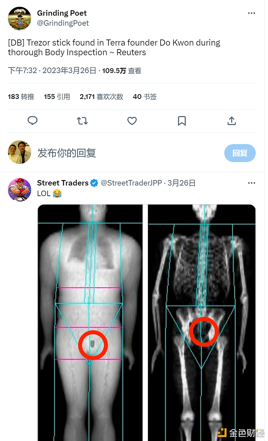 今日社区传播Terra创始人“Do Kwon被捕后在体内发现Trezor硬件钱包”消息,经查证,此消息来源是推特用户GrindingPoet在3月26日透露的不实消息,并称该消息来源于路透社,StreetTrader回复配上今天广泛流传的体检照片。此外,路透社自3月31日后没有Do Kwon相关新闻报道。 此前3月25日报道,Do Kwon被捕现场照片与视频已在网络上曝光。黑山内政部长FilipAdzic此前在其社交平台宣布,Do Kwon因伪造证件被波德戈里察机场警方拘留,此后韩国检方和美国有关部门均希望引渡Do Kwon。