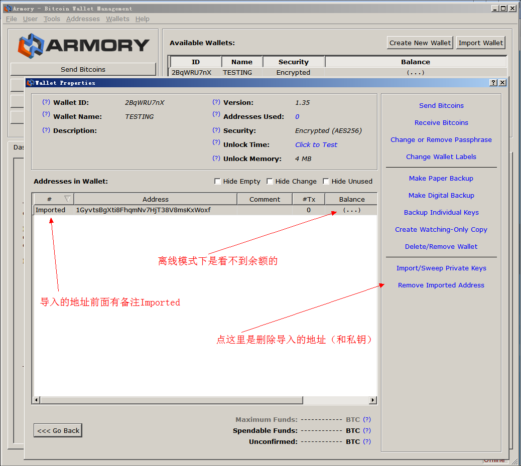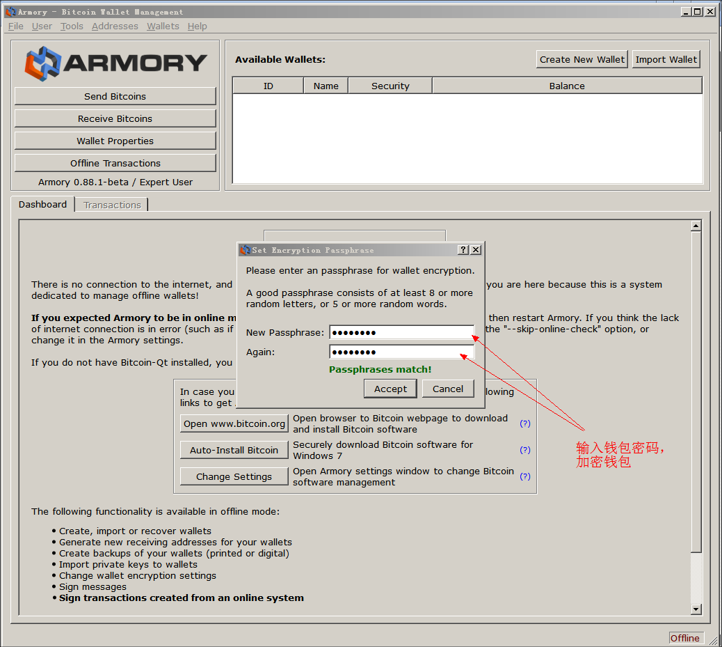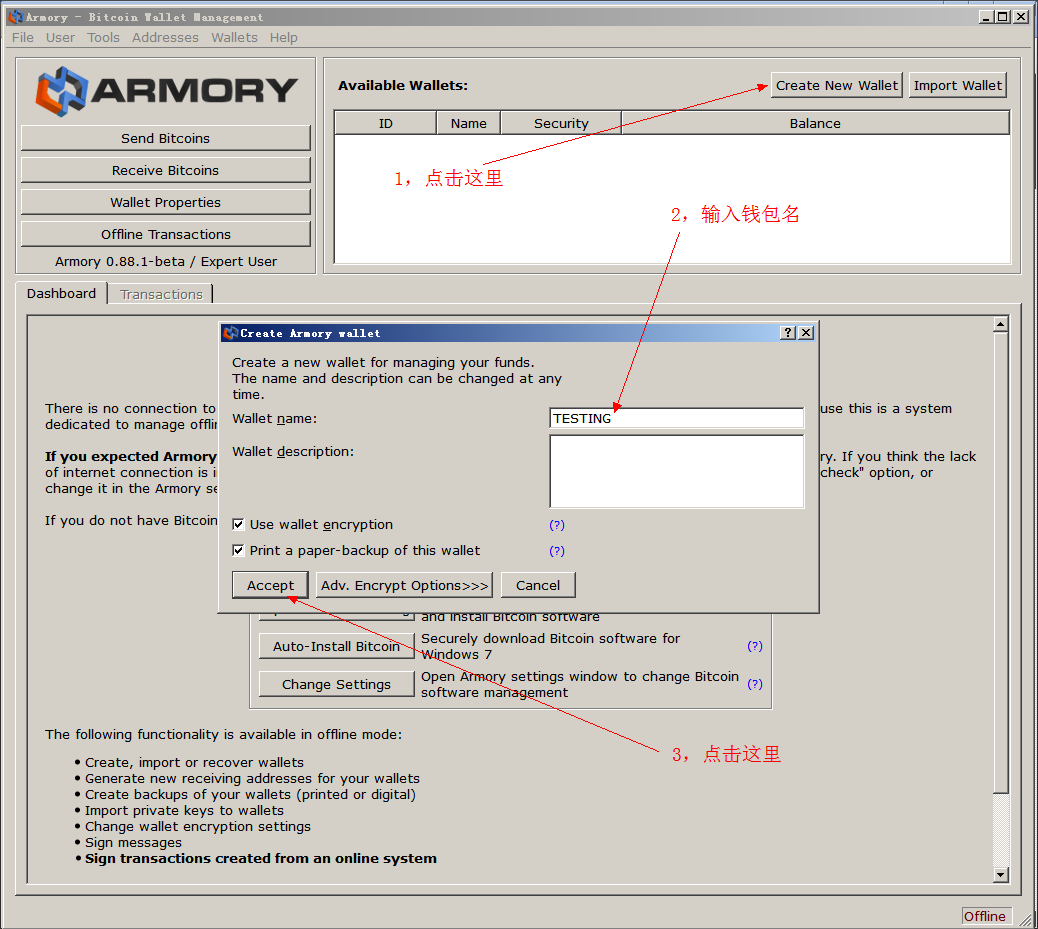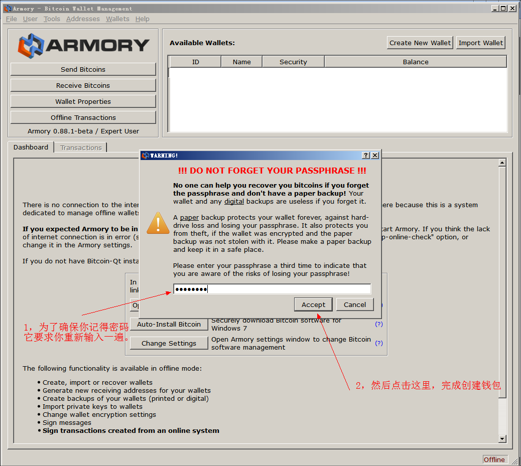 第二步:新建一个Armory钱包,要注意我们的目的不是使用这个钱包的地址和私钥,是用来导入我们脑钱包的私钥和地址的;