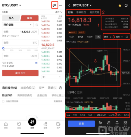 点击右上角价格旁边的K线按钮,页面上方包含了交易币对、涨跌幅、成交价格和成交量等信息。下方是当前币对的K线图,可以调节各种参数。接着下方有【深度】、【成交】两个页面,可以分析行情,点击右侧【币种概况】按钮可以帮您了解当前币种。