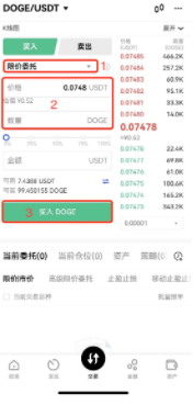 选择【买入】—【限价委托】—输入【价格】、【数量】—点击【买入DOGE】,确认订单。