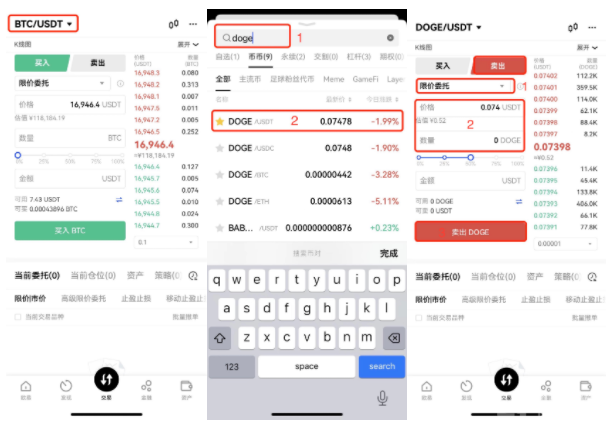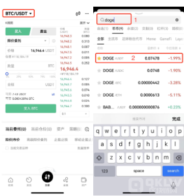 以狗狗币DOGE为例:打开APP,进入【交易】页面—点击左上角币对框【BTC/USDT】;
