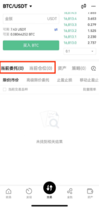 【买入/卖出】页面下方,可以查看【当前委托/仓位/资产】等信息。点击【全部】按钮,可以查看您的【当前委托】(即当前没有成交的挂单)、【历史委托】(即已经成交和已撤销没成交的委托单子),委托单里可以详细看到您的委托时间,币对和成交量等信息。