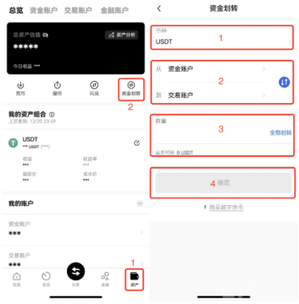 打开欧易APP,点击【资产】—【资金划转】,选择币种以【USDT】为例—从【资金账户】—到【交易账户】—输入划转【数量】—【确定】。