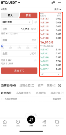【买入/卖出】页面右边是交易深度页面,可以在页面中看到买入和卖出的挂单情况,上方红色区域是卖盘,下方绿色区域是买盘。