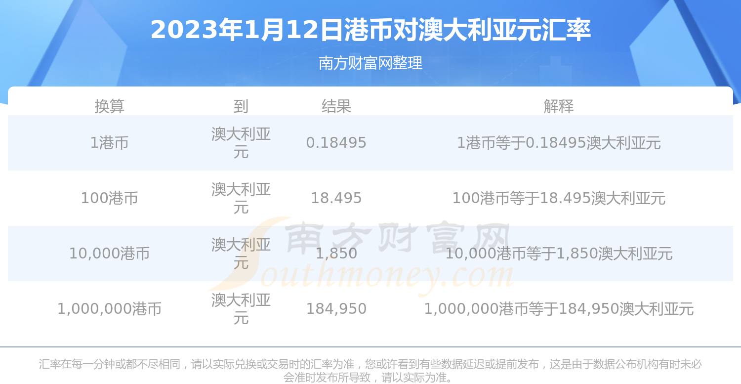 如:1港币、2港币、5港币、10港币、20港币、50港币、100港币,分别折合澳大利亚元0.18495、0.3699、0.92475、1.8495、3.699、9.2475、18.495澳大利亚元。