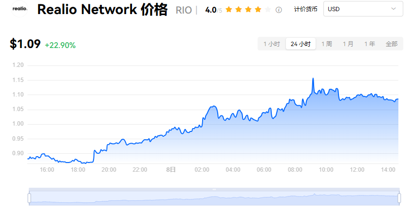 Realio Network 当前价格为 $1.09。Realio Network 的价格在过去 24 小时内上涨了 22.90%。目前,Realio Network 市值排名为第 220 名,实时市值为 $6,023.33万,流通供应量为 5,551.45万 RIO,最大供应量为 7,500.00万 RIO。我们会实时更新 Realio Network/USD 的价格。Realio Network 价格表现 (美元)