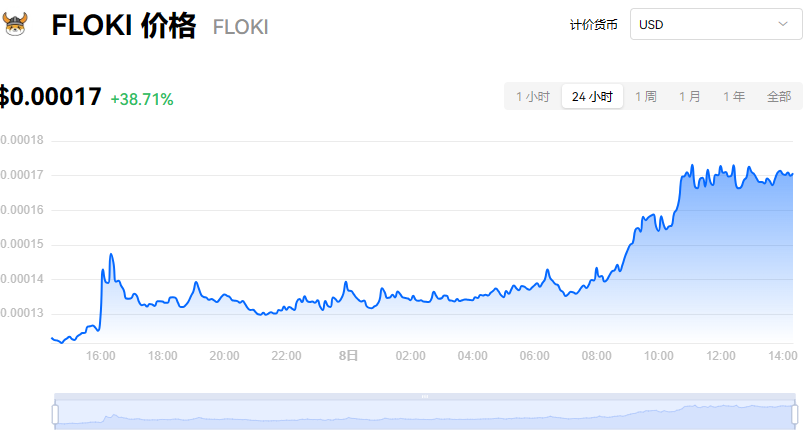 FLOKI 当前价格为 $0.00017。FLOKI 的价格在过去 24 小时内上涨了 38.71%。目前,FLOKI 市值排名为第 56 名,实时市值为 $16.86亿,流通供应量为 99,166.72亿 FLOKI,最大供应量为 100,000.00亿 FLOKI。我们会实时更新 FLOKI/USD 的价格。