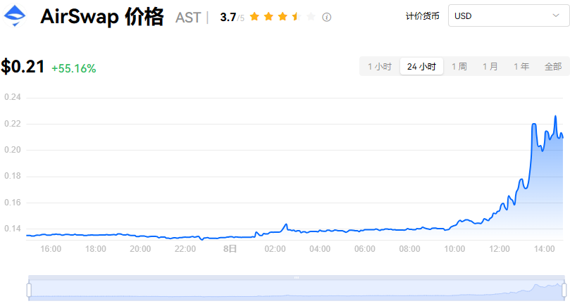 AirSwap 当前价格为 $0.21。AirSwap 的价格在过去 24 小时内上涨了 55.16%。目前,AirSwap 市值排名为第 231 名,实时市值为 $4,334.52万,流通供应量为 2.04亿 AST,最大供应量为 5.00亿 AST。我们会实时更新 AirSwap/USD 的价格。AirSwap 价格表现 (美元)