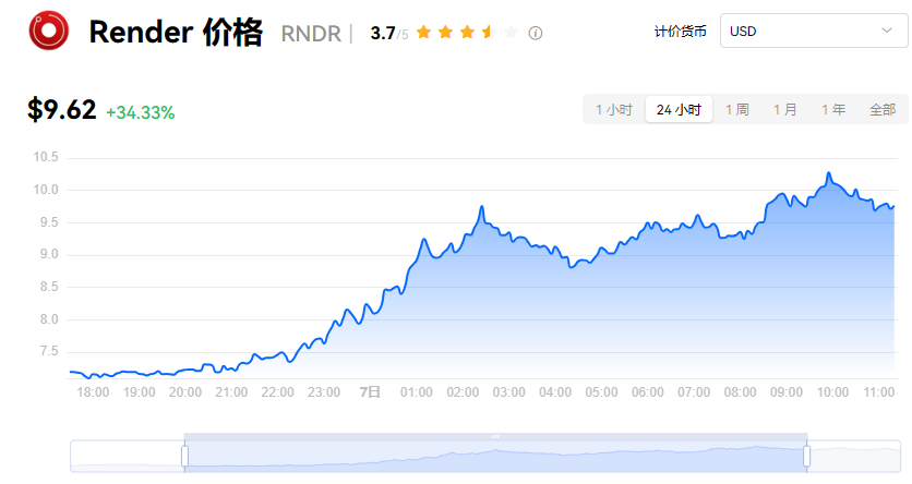 Render 当前价格为 $9.62。Render 的价格在过去 24 小时内上涨了 34.33%。目前,Render 市值排名为第 36 名,实时市值为 $36.41亿,流通供应量为 3.79亿 RNDR,最大供应量为 5.32亿 RNDR。我们会实时更新 Render/USD 的价格。Render 价格表现 (美元)