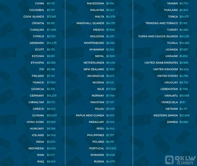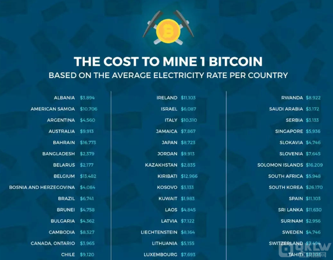 美国Crescent电力供应公司的一家子公司Elite Fixtures ,曾根据政府数据、公用事业公司数据以及IEA、EIA、OANDA等机构的世界报告,以平均电价为基础,研究了在115个国家每开采1枚比特币所花费的成本(此项研究是基于2018年年初时的开采难度以及蚂蚁矿机S9、蚂蚁矿机S7、阿瓦隆6的电力消耗进行计算得出的)。