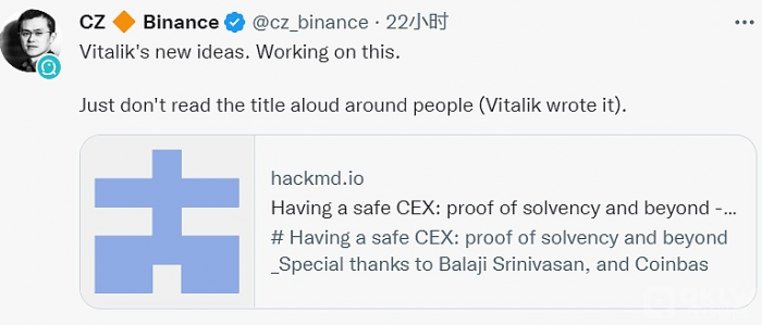 11月20日消息,在Vitalik Buterin发布新文章《拥有一个安全的CEX:证明偿付能力及其他》后,Binance首席执行官CZ在社交媒体上表示将致力于Vitalik的新想法,并坦言自己不太明白Vitalik Buterin文章里的所有方程式,但Binance团队会实施其想法并为行业开源。 此前报道,Vitalik Buterin分析了交易平台进行去中心化资产证明的尝试历史、技术局限性,以及如何使用ZK-SNARK和其他先进技术来极大地简化和改进目前Merkle tree资产证明协议中的隐私问题和稳健性。