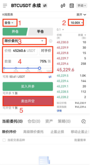 选择【全仓/逐仓】、【杠杆倍数】、【限价委托】—输入【价格】、【数量】—点击【卖出开空】—【确定】。