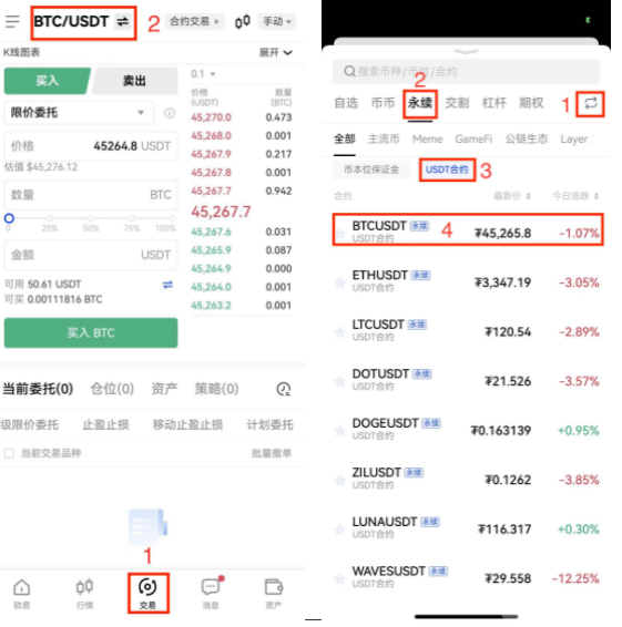 进入【交易】页面,—点击左上角币对框【BTC/USDT】,在新页面下点击切换交易模式—【永续】—【USDT合约】—选择【BTCUSDT永续】。