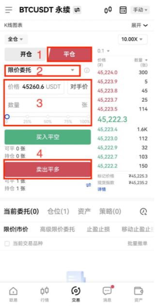 交易页面平多单:点击【平仓】—选择【限价委托】—输入【价格】、【数量】—点击【卖出平多】。