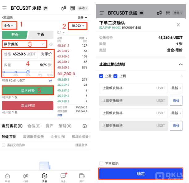 选择【全仓/逐仓】、【杠杆倍数】、【限价委托】—输入【价格】、【数量】—点击【买入开多】—【确定】。