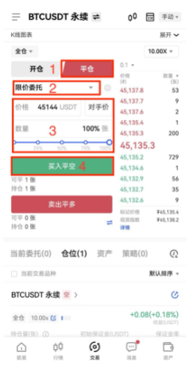 交易页面平空单:点击【平仓】—选择【限价委托】—输入【价格】、【数量】—点击【买入平空】。