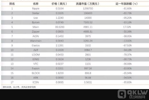 上表为2019年一月跨链项目的市场情况,由上图可看出各项目受市场整体环境影响较大,涨跌幅度较大,Ripple列于第一,市值达12.987亿元,Ripple所建立的全球支付网络,是典型的实时全额支付系统(Real Time Gross Settlement,RTGS),是按国际标准建立的跨银行电子转帐系统。在其主要应用的跨国汇款领域,瑞波网也可看成银行业通行的环球同业银行金融电讯协会SWIFT系统的有力竞争者。但也有部分币值即将归零的跨链项目,如ICON,目前,其面临着巨大的经营困难。