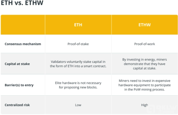 ETHW 之所以吸引矿工,是因为如果没有工作量证明共识机制,他们可能会破产,因为新的代币将通过质押过程添加到区块链中。另一方面,权益证明区块链不是原始以太坊区块链的替代品,而是执行(主网)和共识(信标链)层。