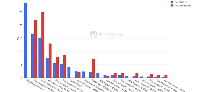 Etherscan 数据显示的是最近按生成的区块百分比和提议的 Tornado 路由器 ( 0xd90e2f9 ) 交易百分比对验证者进行的细分。你可以在最左边看到 Flashbots,最大的区块生成器,验证 0% Tornado 交易。其他人也可能会使用 Flashbot 的中继器。