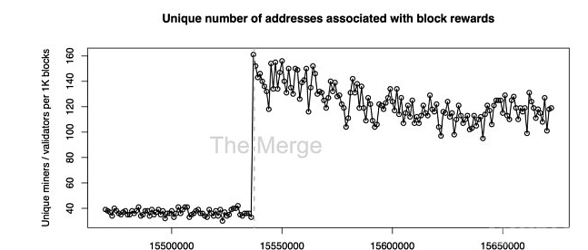 以合并前后数千个区块为例,我们可以查看每个关联区块提议者地址(矿工和验证者)区块集中度。在合并之前,只有十几个挖矿地址与奖励相关联,其中包括 Ethermine 等。合并后,数千个地址与验证者相关。在通过一个急剧变化的阈值交叉后,唯一奖励验证者地址的数量差异变得很大。