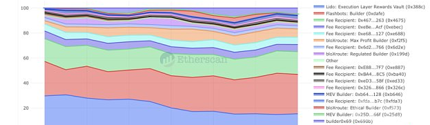 但提议者和构建者的脱钩带来了第二个集中的来源:区块构建者。构建者会影响节点运营商的利润率,构建者和提议者之间存在激励措施,这意味着一个非常成功的构建者可以降低网络的去中心化,例如验证者可以涌向设计精美的构建工具。从过去 2 周的图中可以看出,Flashbots(红色波段)已经开始主导区块构建,仅在其主要收费地址就占了 30% 以上。这在一定程度上降低了以太坊已实现的去中心化。