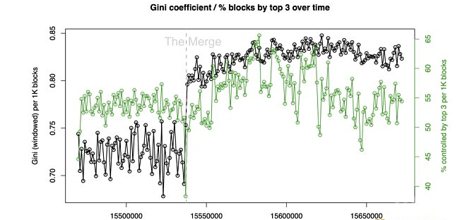 在合并之后,奖励接受者的集中度仍然很高。我们尝试通过基尼系数分析(衡量个人收入分配的指标),来反映每 1000 区块中奖励的集中程度。基尼系数从 0(完全共享的区块)到 1(只属于一个验证者)。我们还可以计算与地址相关的前 3 个区块占用了多少百分比。下图中的两条线显示了该分析随时间的变化: