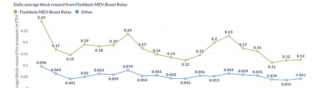 Flashbots 共享透明仪表板报告所有中继和构建活动。(他们最近还宣布了共享基础设施、围绕透明度创建赠款并最终为更加去中心化的区块构建做出贡献的目标。)在撰写本文时,他们服务的总主导地位约为 40%,而且人们可以更加清晰为什么它们对验证者来说是有吸引力的资源: