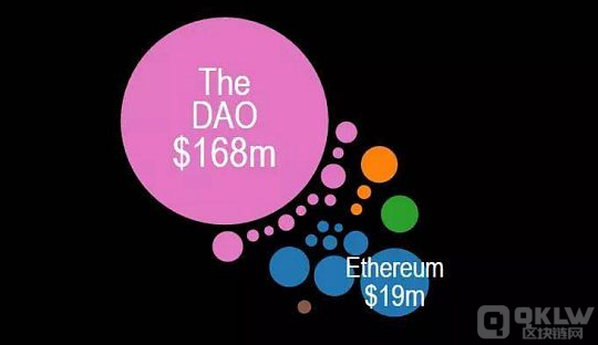 来到2016年,行业开始回暖,并且出现了知名项目The DAO,这个巨无霸项目的规模,让之前其他项目的募集规模显得微不足道,就连以太坊,也变成了一个小圆圈。