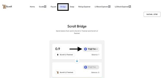 设置 Token 为 TSETH,设置金额即 0.9,然后点击“发送 TSETH 到 Scroll L2 测试网”。