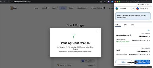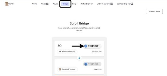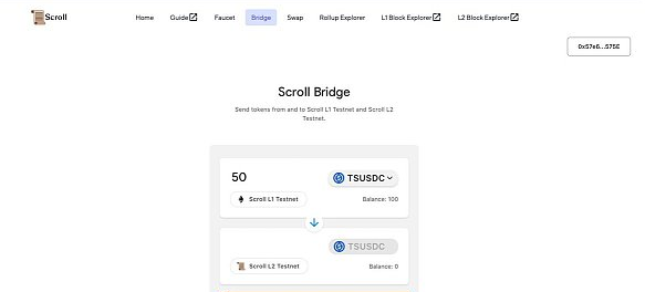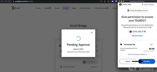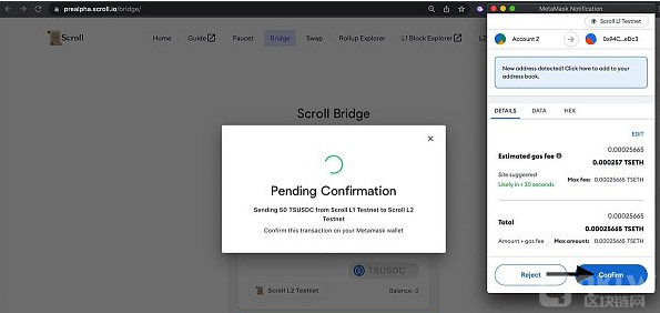 还可以单击发送 TSUSDC 到 Scroll L2 测试网并在 MetaMask 中确认交易。