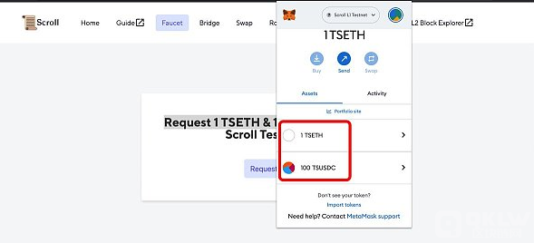 检查你的 MetaMask,你应该看到你收到的测试币,一定要切换到 Scroll Testnet L1 测试网